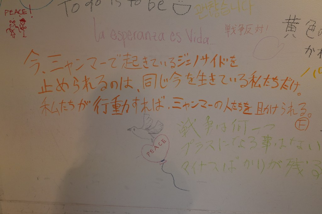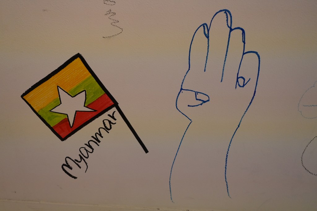 軍による弾圧、逮捕や拘束をされる危険に実際に直面したり、あるいはそうした危機感から祖国であるミャンマーを逃れる人が増えました。一時的避難民、亡命など様々なケースがあります。またインドやタイの国境沿いの地域には、ミャンマーから逃れた人々の拠点になっています。そうした状況の困難を抱えながらも、同時に国内には止まらず、世界各国のたくさんの場所から、さまざまな人々のアクションが続けられています。