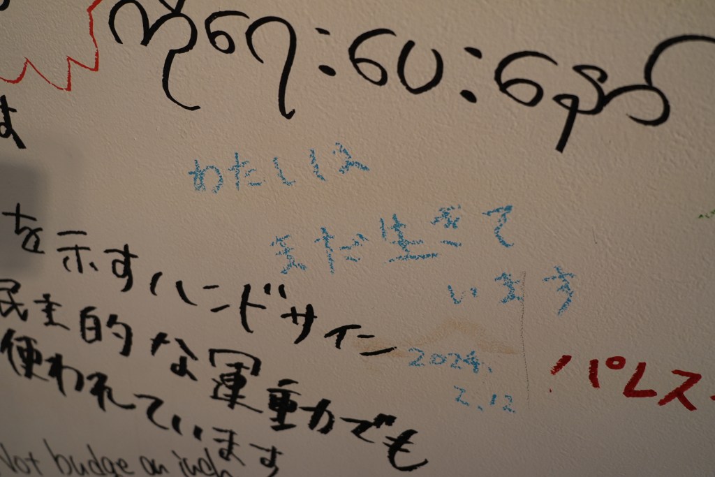本展は、ミャンマーのクーデター以降の現状と、そこで起きている困難、そして絶えず紡がれている希望に目をむけ、訪れる全ての方々が希望の具体化の一端になる場を目指しています。同時に、2024 年の現在、残念ながら、絶望 的な困難は、ミャンマーだけでなく、世界中に広がっています。各地の戦争、災害と、災害によって生まれるさまざ まな問題が次々と起こっています。例を挙げるとキリがないのですが、私が生まれ育った沖縄県でも、辺野古の米軍新基地建設の国による代執行がなされ、大きくなり過ぎた怒りから、諦めに変わるような心情的苦難をどうにかせねばと考え続けています。どこを見渡しても絶望は当たり前のようにあるのが現実社会なのだと思います。そうした残酷な数々の困難に負けないように。そうした時代に生きる 全ての方々に、希望を見つける機会となることを願っています。