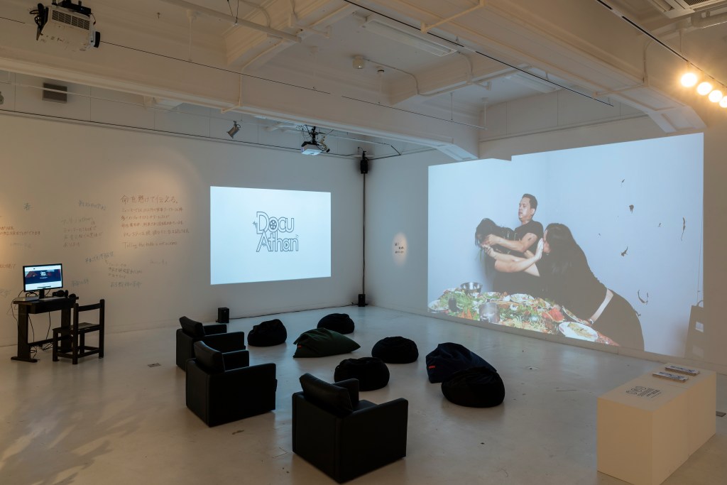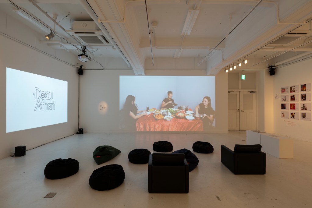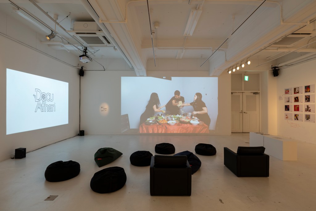 3AM Performance Art Collective はミャンマー出身の3名のアーティストによるコレクティブです。結成されたのはクーデター前の2016 年。当時のミャンマーのパフォーマンスアートシーンでは、いわゆるコレクティブとして創作、発表活動を行う人々も少なく、「同時代のミャンマーではじめてのパフォーマンスアートコレクティブだ」と、3名は説明しています。上記のステートメントにもあるように、《内戦 Civil War》は、ミャンマーの民族間の対立をテーマとした作品です。この作品はクーデター前に発案された「共に食事をする家族が突如として野蛮な行為(争い)を始める」という、即興的なパフォーマンス作品として実践されていました。しかし、クーデターが起こります。ここで展示されているビデオ作品は、クーデター後、軍の弾圧を逃れながら、パフォーマンス作品をビデオ作品化したものです。またクーデター以前のパフォーマンスの時から、上述したような、いくつかの新しい行為が追加されています。クーデター以降、3名はミャンマーを離れ、バラバラになって暮らしています。